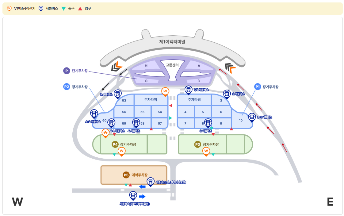 - 제1터미널: 장기주차장 (셔틀버스 이용 필요)