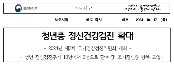 최근 보건복지부는 2024년 제3차 국가건강검진위원회를 통해 청년층(20~34세)을 대상으로 정신건강검진 주기도 기존 10년에서 2년으로 단축한다는 계획을 발표했습니다.