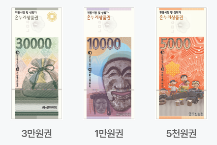 전국 16개 금융기관에서 5천원, 1만원, 3만원권 단위로 구매하여 사용하는 온누리상품권